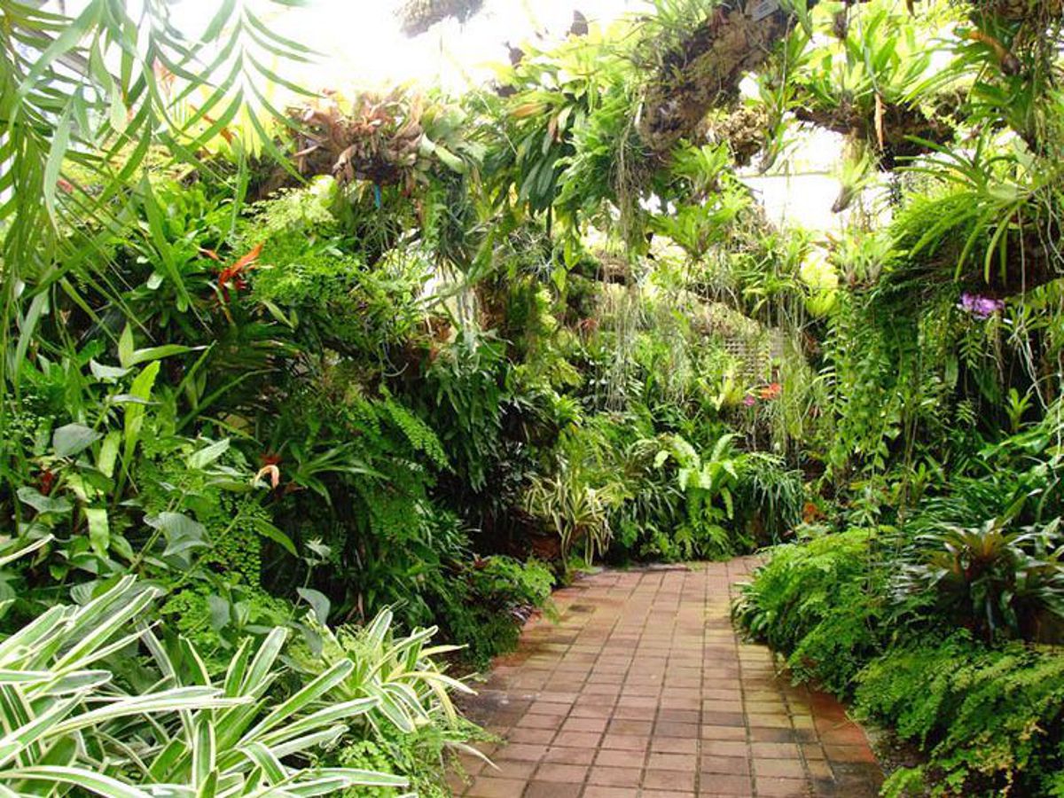 Con plantas de colores muy variados y brillantes, de formas muy diversas y diferentes, palmeras de las más diversas especies, plantas colgantes y más.